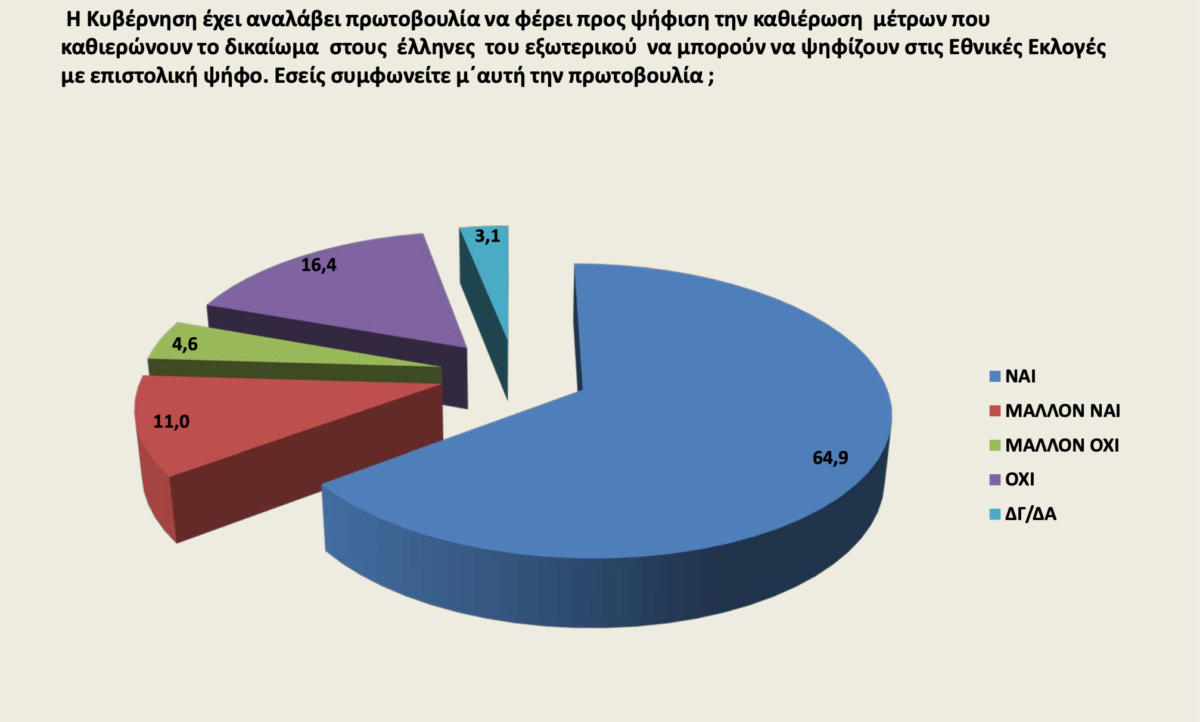 Συντριπτικό είναι το ποσοστό (64,9%) που συμφωνεί με την πρωτοβουλία της κυβέρνησης για την ψήφο των αποδήμων. Το 11% «μάλλον» συμφωνεί, το 16,4% διαφωνεί.