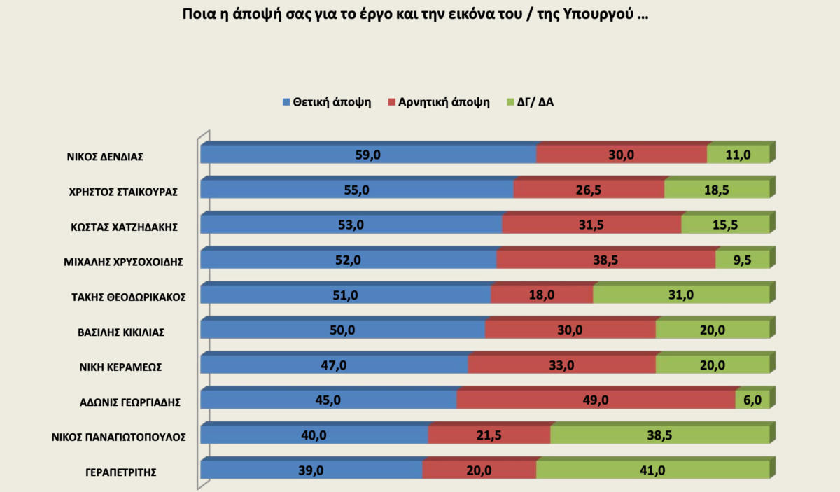 Η δημοσκόπηση της Opinion Poll «μετρά» και τη γνώμη των πολιτών για τους υπουργούς. Πρώτος σε θετικές απόψεις είναι ο υπουργός Εξωτερικών Νίκος Δένδιας (59%), ακολουθεί ο υπουργός Οικονομικών Χρήστος Σταϊκούρας (55%) και ακολουθεί ο υπουργός Ενέργειας και Περιβάλλοντος, Κωστής Χατζηδάκης (53%).