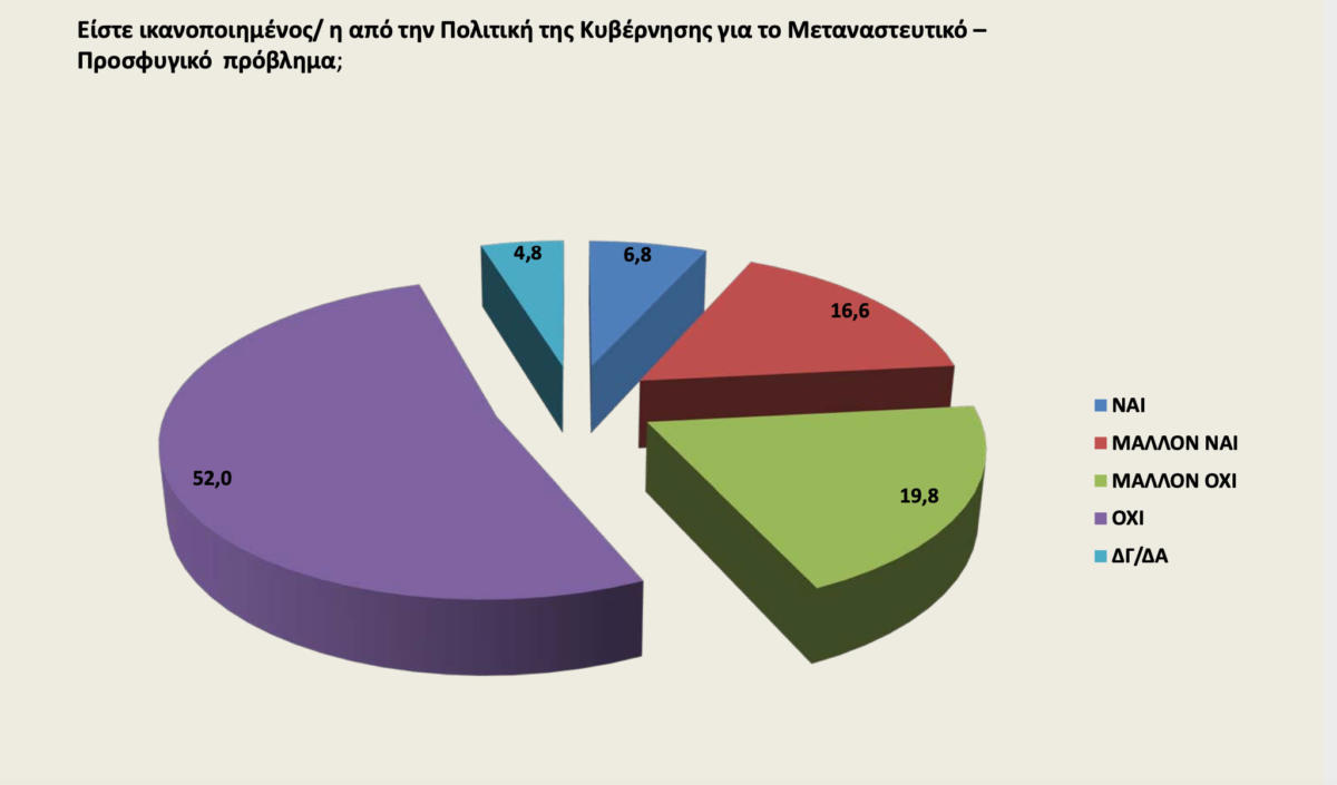 «Αγκάθι» για την κυβέρνηση αποδεικνύεται το μεταναστευτικό / προσφυγικό. Στην ερώτηση για το πόσο ικανοποιημένοι είναι οι ερωτηθέντες από την πολιτική της κυβέρνησης στο συγκεκριμένο θέμα, «όχι» απαντά το 52% και «ναι» μόλις το 6,8%. Μάλιστα, το 51% δηλώνει πως συμφωνεί με την κριτική πως η κυβέρνηση δεν έδειξε έτοιμη και καθυστέρησε στο συγκεκριμένο θέμα. Το ποσοστό γίνεται ακόμη μεγαλύτερο αν συνυπολογιστεί και το 13,2% του «μάλλον συμφωνώ».