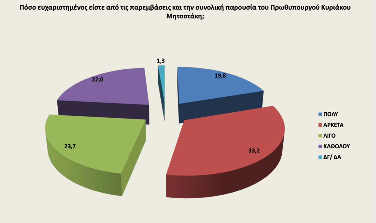 Στο ερώτημα για τη συνολική παρουσία και τις παρεμβάσεις του πρωθυπουργού Κυριάκου Μητσοτάκη, το 19,8% απαντά «πολύ», το 33,2% αρκετά, το 23,7% «λίγο» και το 22% «καθόλου».