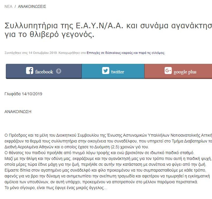 Η Ένωση Αστυνομικών Υπαλλήλων Νοτιοανατολικής Αττικής εξέφρασε τα συλλυπητήρια της, στον πατέρα του παιδιού.