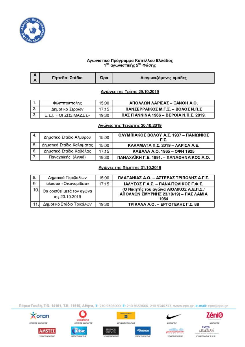 Ανακοινώθηκε από την ΕΠΟ το πρόγραμμα της πρώτης αγωνιστικής της 5ης φάσης του Κυπέλλου Ελλάδας, εκεί όπου ξεχωρίζει ο αγώνας του Παναθηναϊκού.