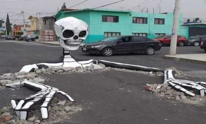 Για τον εορτασμό της Μέρας των Νεκρών, σήμερα, 1η Νοεμβρίου, ο Ραϊμούντο Μεντίνα (Raymundo Medina) φιλοτέχνησε έναν πελώριο σκελετό που μοιάζει να αναδύεται από την άσφαλτο ενός δρόμου της Σάντα Σεσίλια Τλάχουακ, στο Μεξικό. Σωροί θρυμματισμένου τσιμέντου στα σημεία όπου το γλυπτό έρχεται σε επαφή με τον δρόμο δημιουργούν τη ψευδαίσθηση ότι ο σκελετός σηκώνεται από τα έγκατα της γης και τρυπάει την άσφαλτο για να βγει στην επιφάνεια.