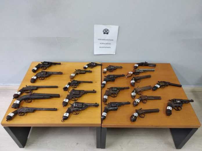 Μέσα στον ταξιδιωτικό σάκο βρέθηκαν 11 περίστροφα, 4 πυροβόλα όπλα χειρός μονής βολής, εμπροσθογεμές όπλο χειρός, δίκαννο με εξωτερικές σφύρες, ένα δίκαννο όπλο χειρός λειόκαννο με εξωτερικές σφύρες, 2 εμπροσθογεμή τρίκαννα όπλα χειρός μαύρης πυρίτιδας, εμπροσθογεμές εξάκαννο όπλο χειρός μαύρης πυρίτιδας, εμπροσθογεμές δίκαννο όπλο χειρός μαύρης πυρίτιδας, εμπροσθογεμές δίκαννο τύπου πιστόλας με εξωτερικές σφύρες, 3 σπαθιά, 9 ξιφολόγχες πολεμικών τυφεκίων, 4 θήκες ξιφολογχών, 2 ξιφίδια και 2 ματσέτες.