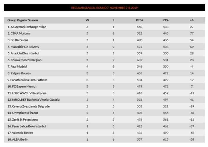 Η Αρμάνι Μιλάνο «πέρασε» με… φόρα πάνω από το εμπόδιο της Μπασκόνια και παρέμεινε στην κορυφή της Euroleague ενώ η Μακάμπι του Γιάννη Σφαιρόπουλου έκανε «πάρτι» κόντρα στην Άλμπα Βερολίνου και πήρε την 5η σερί της νίκη στη διοργάνωση. Ρεάλ Μαδρίτης και Χίμκι πήραν εύκολες νίκες. Όλα τα αποτελέσματα της πρώτης ημέρας της 7ης αγωνιστικής και η βαθμολογία στη Euroleague.