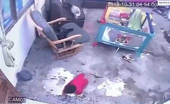 Το παιδάκι έπαιζε μόνο του στο δωμάτιο όπου η γάτα ως συνήθως μισοκοιμόταν σε μια πολυθρόνα. Το παιδί κατέβηκε, μπουσούλησε και κατευθυνόταν προς την πόρτα του δωματίου όπου υπήρχαν πολλά σκαλοπάτια που οδηγούσαν στον κάτω όροφο.