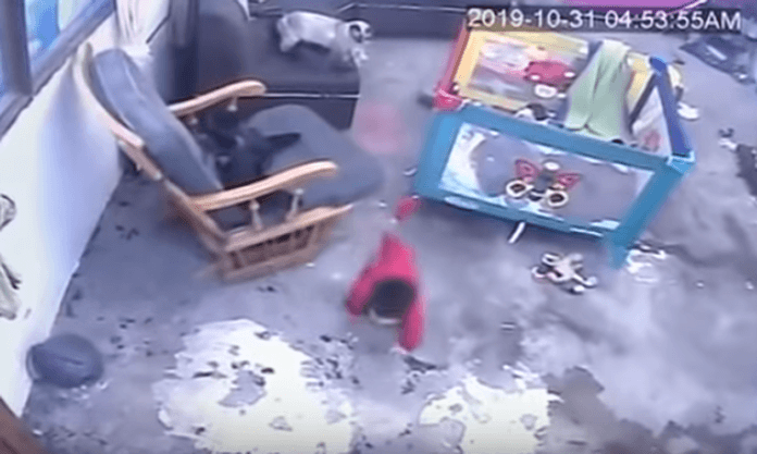 Κάποια στιγμή, η γάτα, ενώ καθόταν πάνω στον καναπέ και παρατηρούσε το μωρό, καθώς το μωρό μπουσουλούσε προς μια ανοιχτή πόρτα, κάνει ένα άλμα και κατευθύνεται κατά πάνω του! Η γάτα φαίνεται να σπρώχνει το μωρό ξανά πίσω προς το δωμάτιο και όταν τα καταφέρνει κάθεται μπροστά στην πόρτα και συνεχίζει να το παρακολουθεί. Ισως, όπως υποστηρίζει το China press η πόρτα δεν οδηγεί σε κάποιο άλλο δωμάτιο ή διάδρομο αλλά σε μια σκάλα! Και η κίνηση της γάτας ερμηνεύεται σαν μια κίνηση προστασίας του μωρού!