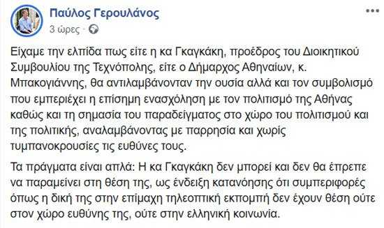 Ο Παύλος Γερουλάνος δημοσίευσε στον προσωπικό του λογαριασμό στο Facebook ανάρτηση-κόλαφο εναντίον της Κατερίνας Γκαγκάκη για το ατυχές περιστατικό στην τηλεοπτική εκπομπή που αυτή συμμετέχει με το χλευασμό φοιτήτριας που υπέστη σεξουαλική παρενόχληση στο ΑΠΘ.