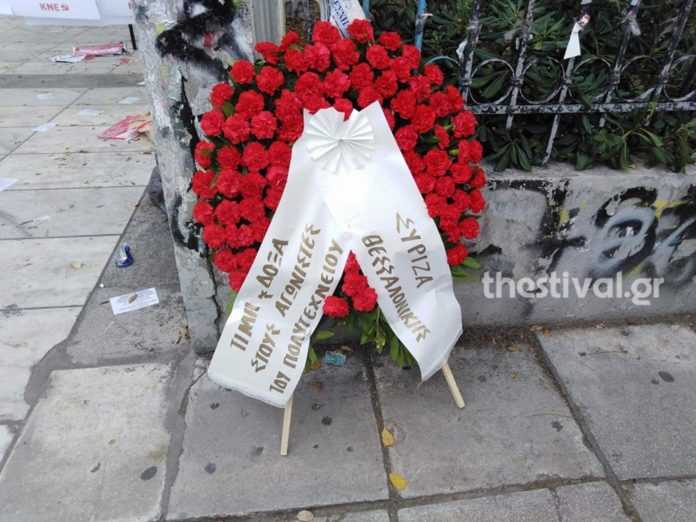Φοιτητές που έχουν αποκλείσει την είσοδο της Σχολής, δεν επέτρεψαν αρχικά σε αντιπροσωπεία του ΣΥΡΙΖΑ να περάσει προκειμένου να καταθέσει στεφάνι στο μνημείο της Πολυτεχνικής Σχολής του ΑΠΘ.