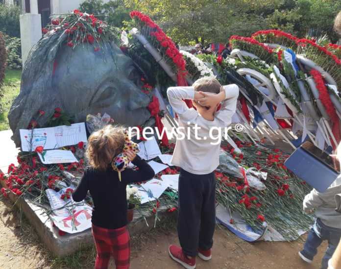 Στον προαύλιο χώρο του Πολυτεχνείου βρίσκονται περισσότεροι από 500 άνθρωποι, μέλη της Κομμουνιστικής Νεολαίας και άλλων οργανώσεων της εξωκοινοβουλευτικης Αριστεράς, αλλά και γονείς με τα παιδιά τους τα οποία για πρώτη φορά επισκέπτονται τον ιερό χώρο, όπου τη 17η του Νοέμβρη 1973 έλαβε χώρα η μαζικότερη πράξη αντίστασης κατά της Χούντας.