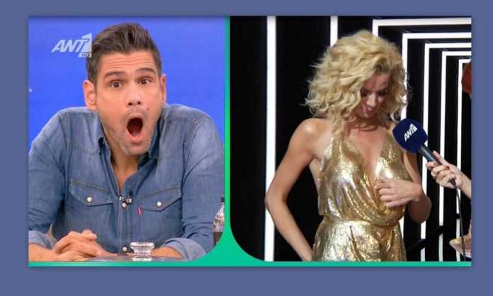 Ένα απόσπασμα από τα backstage πρόβαλε το Πρωινό και ο Δημήτρης Ουγγαρέζος έμεινε άφωνος μόλις είδε το τεράστιο βαθύ ντεκολτέ της Ζέτας Μακρυπούλια, ενώ η κάμερα λίγο αργότερα τον τσάκωσε να…παραμιλά και να κάνει γκριμάτσες!