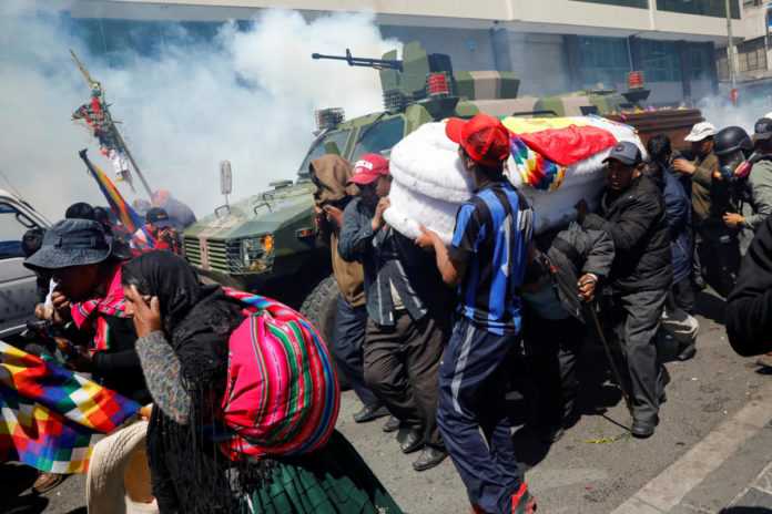 Στην πλατεία του Αγίου Φραγκίσκου, στο κέντρο της Λα Πας, άνθρωποι που μετέφεραν δύο από τα φέρετρα, καλυμμένα με λουλούδια και την ουιφάλα, την πολύχρωμη σημαία των αυτοχθόνων των Άνδεων, αναγκάστηκαν εξαιτίας του πυκνού νέφους των δακρυγόνων να τα αφήσουν για λίγο κάτω, μερικά μέτρα από ένα στρατιωτικό όχημα αντιμετώπισης ταραχών.