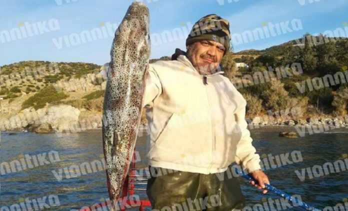 Τρόμο προκαλεί το μέγεθος του λαγοκέφαλου που έπιασε ψαράς στη Βιάννο.