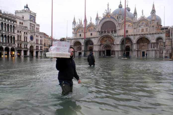 Στα πλάνα που μεταδίδουν τα τηλεοπτικά δίκτυα διακρίνονται άνθρωποι στη διάσημη πλατεία του Αγίου Μάρκου, να περπατούν με το νερό πάνω από το γόνατό τους.