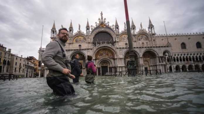 Στα πλάνα που μεταδίδουν τα τηλεοπτικά δίκτυα διακρίνονται άνθρωποι στη διάσημη πλατεία του Αγίου Μάρκου, να περπατούν με το νερό πάνω από το γόνατό τους.