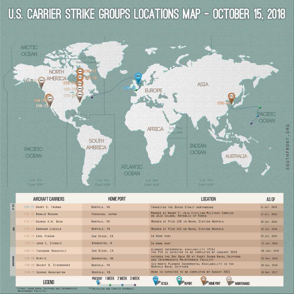 Σύμφωνα με τον χάρτη που δημοσιεύτηκε, το αεροπλανοφόρο CVN-75 Harry S. Truman βρίσκεται νότια της νήσου Bodo στην Νορβηγία στο πλαίσιο ΝΑΤΟικής άσκησης σε κοντινή σχετικά απόσταση από τις βάσεις του Στόλου του Β. Ατλαντικού του Ρωσικού Ναυτικού, ενώ το αεροπλανοφόρο CVN-76 Ronald Reagan πλέει στην Θάλασσα των Φιλιππίνων ανατολικά της Ταιβάν.