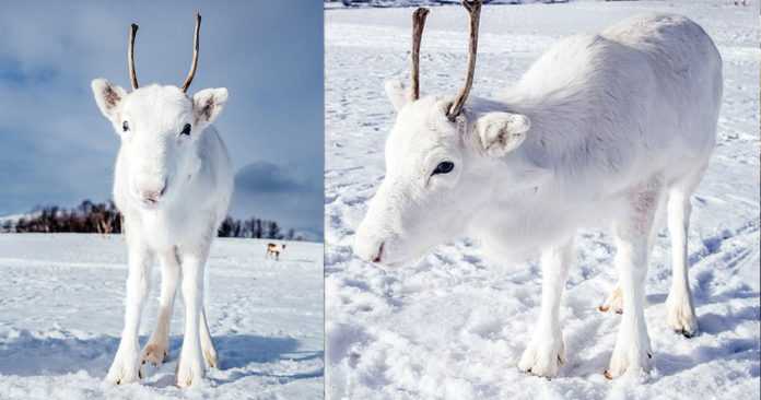 Ο αξιολάτρευτος λευκός τάρανδος εμφανίστηκε μαζί με την καφέ μητέρα του στην βόρεια Νορβηγία και φωτογραφήθηκε με χαρά μπροστά το χιονισμένο τοπίο.