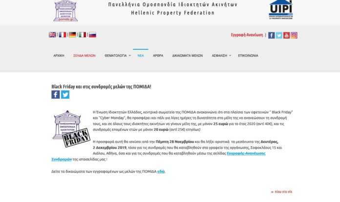 Black Friday και στις συνδρομές; Κι όμως το είδαμε κι αυτό. Στο επίσημο site της η Πανελλήνια Ομοσπονδία Ιδιοκτητών Ακινήτων κάνει Black Friday στις συνδρομές!