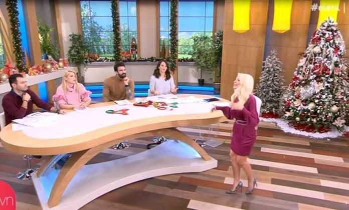 Η παρουσιάστρια άρχισε να δείχνει το φόρεμά της και οι συνεργάτες της εντυπωσιάστηκαν με το χρώμα του.