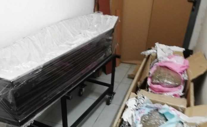 Στη συνέχεια σε έρευνα που πραγματοποιήθηκε με τη συνδρομή δικαστικών λειτουργών, σε επιχείρηση – γραφείο τελετών της 37χρονης και συγκεκριμένα εντός φέρετρου, βρέθηκαν και κατασχέθηκαν συνολικά ποσότητες κάνναβης, συνολικού βάρους -35,180- γραμμαρίων.