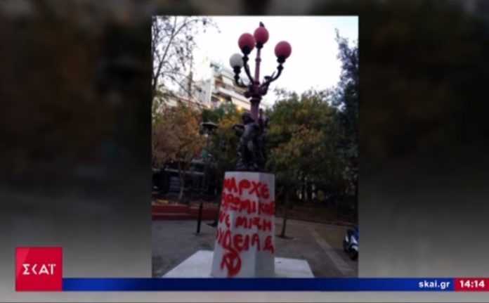 Βανδάλισαν για τρίτη φορά το άγαλμα που βρίσκεται στο κέντρο της πλατείας Εξαρχείων.