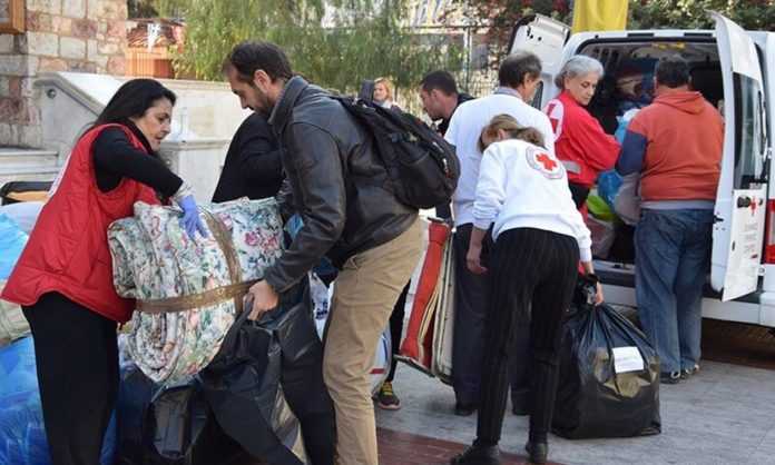 Ο Ελληνικός Ερυθρός Σταυρός, με κλιμάκια εθελοντών, βρέθηκε από νωρίς το πρωί της Τρίτης στα οκτώ σημεία συγκέντρωσης ειδών πρώτης ανάγκης, παραμένοντας μέχρι αργά το απόγευμα ώστε η υλική βοήθεια να φορτωθεί στα φορτηγά του Ε.Ε.Σ. και να μεταφερθεί στην Κεντρική Αποθήκη.