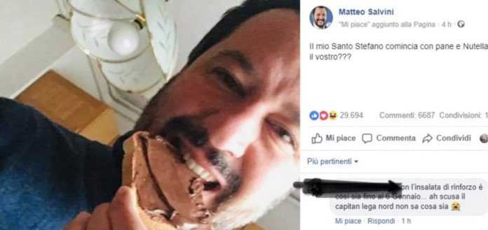 Λίγο νωρίτερα, η ίδια οπαδός τον είχε ρωτήσει εάν κρύωνε εκείνο το παγωμένο βράδυ της συγκέντρωσης. «Όχι κυρία μου, εγώ δεν κρυώνω…είμαι καλά. Έπειτα, εγώ τρώω ψωμί και σαλάμι και δύο σαρδέλες και είμαι ακόμη καλύτερα», αστειεύθηκε ο Σαλβίνι και μόλις η κυρία του υπενθύμισε πως στις αναρτήσεις του τρώει Nutella, ο ακροδεξιός ηγέτης βρήκε ευκαιρία κι εξαπέλυσε τον φιλιππικό του για τα τουρκικά φουντούκια στο συγκεκριμένο διατροφικό προϊόν.