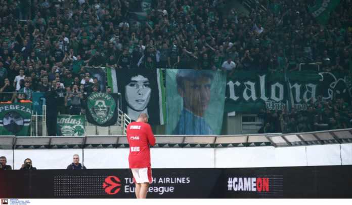 Οι “πράσινοι” αντιμετωπίζουν τον Ολυμπιακό στο “αιώνιο” ντέρμπι τη Ελλάδας στο πλαίσιο της Euroleague και στις εξέδρες υπήρξαν πανό τόσο με τη φωτογραφία του, όσο και υβριστικά κατά της αστυνομίας και των ΜΑΤ.
