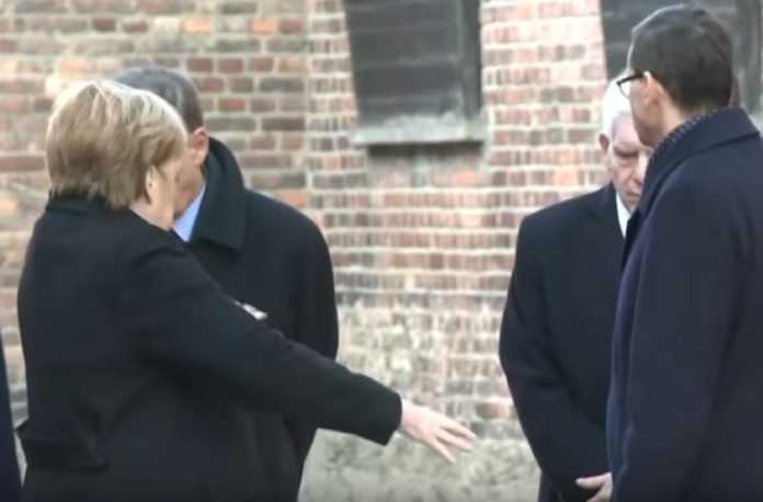Η Μέρκελ όπως φαίνεται στο βίντεο, δείχνει να κλονίζεται μετά την κατάθεση στεφανίου στην μνήμη των θυμάτων Ολοκαυτώματος στο στρατόπεδο συγκέντρωσης του Άουσβιτς.