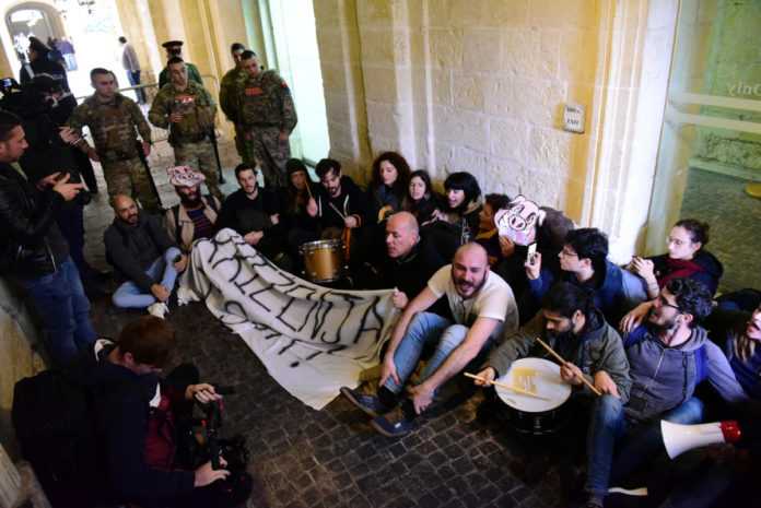 Περίπου 40 ακτιβιστές εισέβαλαν στο κτίριο αυτό του 16ου αιώνα στο κέντρο της Βαλέτας, αφού κατάφεραν να περάσουν από τους αστυνομικούς και τους στρατιώτες που το φυλούν από μία πλαϊνή είσοδο, κρατώντας τύμπανα, σφυρίχτρες, σημαίες και ντουντούκες.