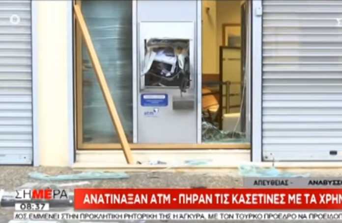 Στις εικόνες που μετέδωσε ο ΣΚΑΪ φαίνεται το μηχάνημα διαλυμένο και τα κομμάτια του να είναι… παντού, ενώ ζημιές προξένησαν και στην τράπεζα αφού έσπασαν τα τζάμια.
