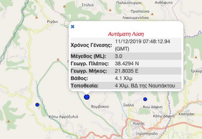 Ο σεισμός των 3 ρίχτερ έγινε στις 09:48 και είχε εστιακό βάθος 4,1 χιλιόμετρα σύμφωνα με το Γεωδυναμικό Ινστιτούτο. Το επίκεντρο ήταν 4 χιλιόμετρα βορειοδυτικά της Ναυπάκτου.