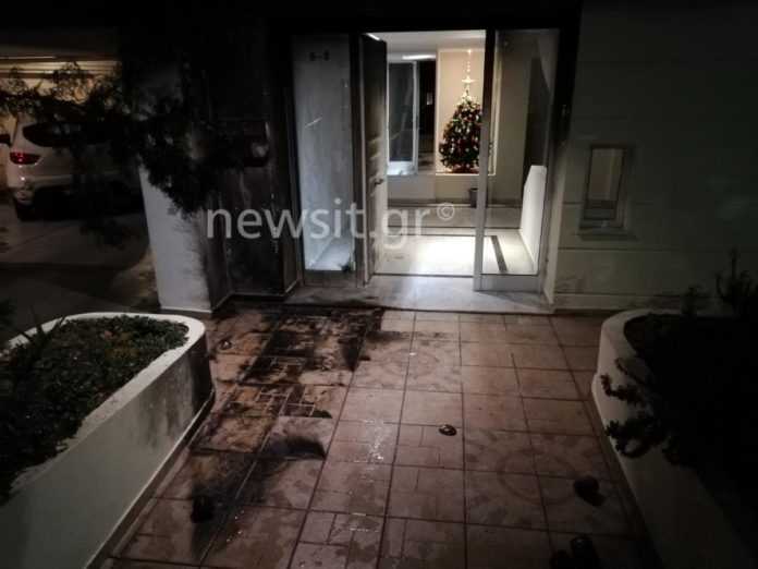 Από την έκρηξη προκλήθηκαν υλικές ζημιές στην είσοδο της πολυκατοικίας.