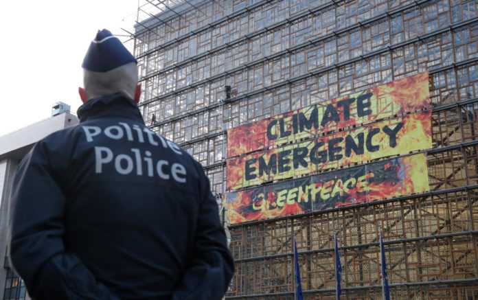 Οι ακτιβιστές σκαρφάλωσαν στην μεταλλική πρόσοψη του κτιρίου Europa , της νέας έδρας του Ευρωπαϊκού Συμβουλίου και άπλωσαν ένα μεγάλο πανώ με το σύνθημα «Κλιματική Εκτακτη Ανάγκη».