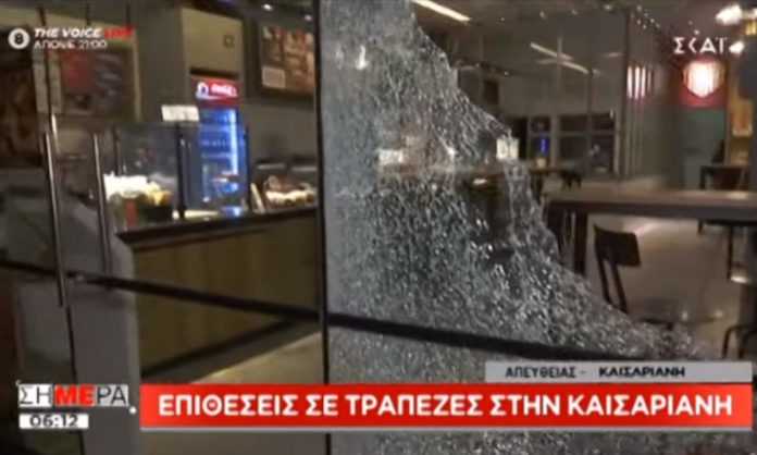 Σύμφωνα και με τα όσα μετέδωσε ο ΣΚΑΪ, αντιεξουσιαστές πήραν “σβάρνα” 2 υποκαταστήματα τραπεζών και ένα fast food στην οδό Εθνικής Αντιστάσεως στην Καισαριανή.