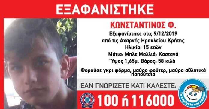 Πρόκειται για τον Κωνσταντίνο Φ., 15 ετών τα ίχνη του οποίου χάθηκαν στις 09.12.2019 και ώρα 18:00 από την περιοχή Αρχάνες στο Ηράκλειο Κρήτης.