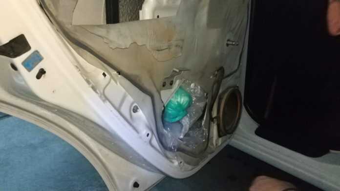 Σε έλεγχο που διενήργησαν στο ύψος της Λεπτοκαρυάς Πιερίας, βρέθηκαν στο εσωτερικό του αυτοκινήτου επιμελώς κρυμμένα στην ταπετσαρία της πίσω αριστερής πόρτας 11 δέματα ηρωίνης συνολικού βάρους 5 κιλών και 672 γραμμαρίων, καθώς και 1 δέμα κοκαΐνης βάρους 154 γραμμαρίων.