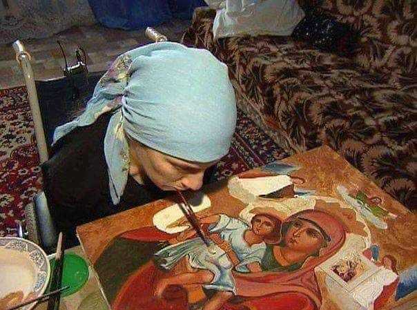 Αίσθηση και συγκίνηση προκαλεί η φωτογραφία μιας παραπάνω από ταλαντούχας γυναίκας που ζωγραφίζει αγιογραφίες με το στόμα.
