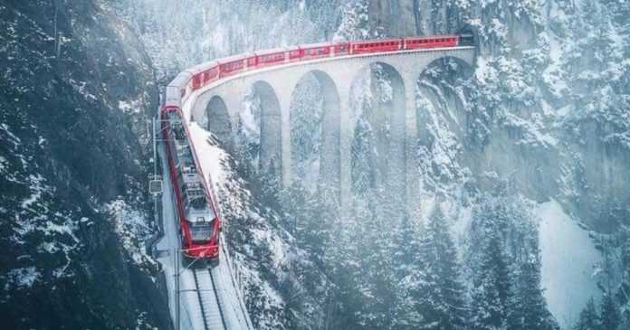 Πιο συγκεκριμένα, στη λευκή πανδαισία των Άλπεων, μια κόκκινη γραμμή προσθέτει μια διαφορετική χρωματική πινελιά. Δεν είναι άλλο από τα βαγόνια του τρένου Bernina Express που «σπάνε» τη χρωματική ομοιομορφία του εκθαμβωτικού αλπικού τοπίου της Ελβετίας.