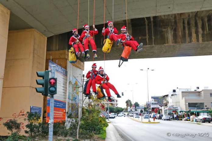 Άγιοι Βασίληδες αναρριχήθηκαν σε γέφυρα του ΒΟΑΚ στο Ηράκλειο, χαρίζοντας θεαματικές εικόνες στους οδηγούς, την Κυριακή (22.12.2019).