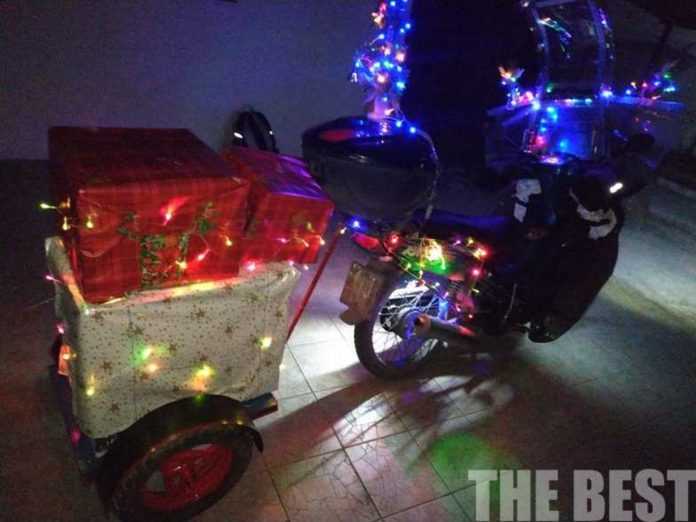 Έχοντας μετατρέψει το δίκυκλό του, σε Χριστουγεννιάτικο δέντρο, με λαμπάκια, στολίδια ακόμη και λούτρινα αρκουδάκια στο μπροστινό τμήμα του, στην Πάτρα αποφάσισε να κάνει ένα ακόμη βήμα. Και καθώς μετράμε αντίστροφα για τα Χριστούγεννα, σαν καλός διανομέας, σκέφτηκε πως εκτός από καφέ και άλλα εδέσματα, μπορεί να μοιράζει και δώρα.