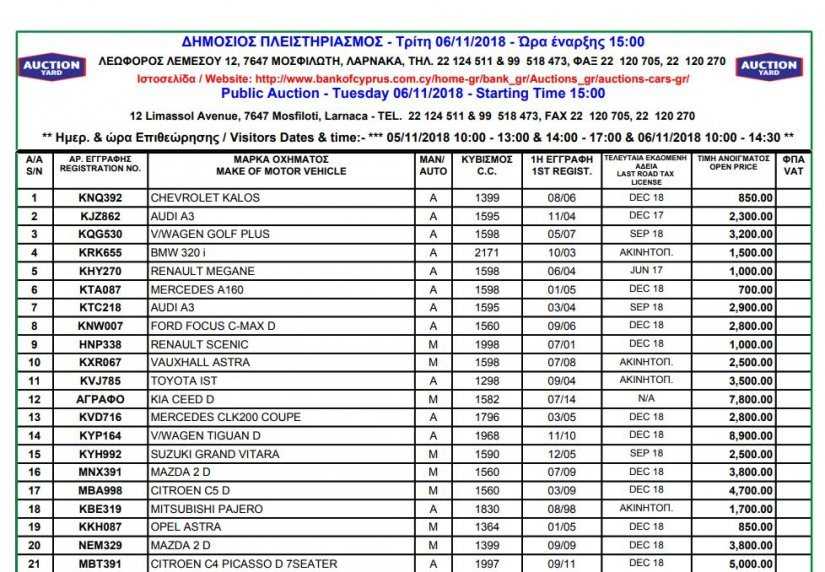 Σε δημόσιο πλειστηριασμό βγάζει σειρά αυτοκινήτων η Τράπεζα Κύπρου. Οι τιμές κυμαίνονται από μόλις €250 μέχρι €8.900, με τον κατάλογο να περιλαμβάνει πλήθος μοντέλων και μαρκών