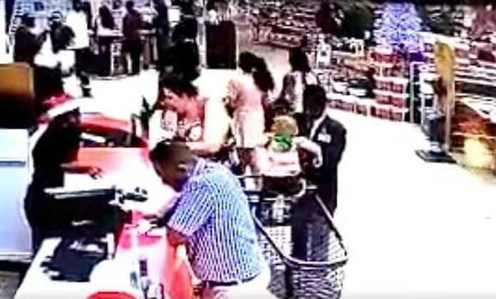 Στο βίντεο που κατέγραψε το κύκλωμα ασφαλείας φαίνεται η γυναίκα να μιλά με μία υπάλληλο του καταστήματος με το μικρό αγοράκι να κάθεται στην ειδική θέση που έχουν τα καρότσια του σούπερ μάρκετ για τα παιδιά. Λίγο αργότερα, ένας από τους άνδρες του προσωπικού ασφαλείας του καταστήματος παίρνει το παιδί από το καρότσι και κατευθύνεται προς την έξοδο.