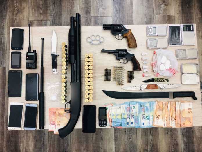 Στο μεταξύ, σε έρευνες που έγιναν στα σπίτια και στα αυτοκίνητα των μελών της σπείρας, καθώς και σε χώρους αποθήκευσης, παρουσία δικαστικού λειτουργού, οι αστυνομικοί βρήκαν μεταξύ άλλων 47,8 γραμμάρια κοκαΐνης, 7,4 γραμμάρια άγνωστης ουσίας σε κρυσταλλική μορφή, δύο περίστροφα, μια επαναληπτική καραμπίνα, 181 φυσίγγια, ένα μαχαίρι τύπου ματσέτα, μια σιδερογροθιά, ένα πτυσσόμενο γκλοπ, ένα φορητό ασύρματο, τέσσερις ηλεκτρονικές ζυγαριές ακριβείας, κ.α.