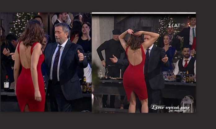 Ο Αντύπας ερμήνευε «βάλε το κόκκινο φουστάνι, εκείνο που σε κάνει να μοιάζεις πυρκαγιά» και η Κατερίνα Λιόλιου που φορούσε ένα κατακόκκινο θεόστενο φόρεμα άρχισε να λικνίζεται σιγά σιγά και σαγήνευσε ακόμα και τον οικοδεσπότη, Σπύρο Παπαδόπουλο που σηκώθηκε από τη θέση του για να χορέψει μαζί της…