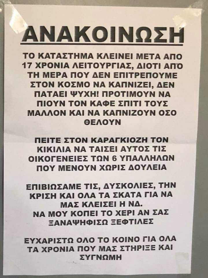 Όπως ο ίδιος καταγγέλλει, το μαγαζί του κλείνει μετά από 17 χρόνια επιχειρηματικής δραστηριότητας εξαιτίας του μειωμένου τζίρου που έχει προκύψει από την εφαρμογή του αντικαπνιστικού νόμου.