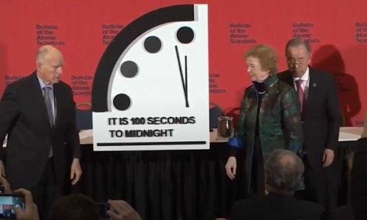 Οι δείκτες του «ρολογιού της Αποκάλυψης», που υπάρχει από το 1947 για να συμβολίζει το επικείμενο της απόλυτης καταστροφής του πλανήτη, απέχουν πλέον από τα μεσάνυχτα 100 δευτερόλεπτα, σύμφωνα με την επιστημονική ομάδα που το χειρίζεται και υπογραμμίζει τους κινδύνους που εγείρουν η κλιματική αλλαγή και η διάδοση των πυρηνικών όπλων.