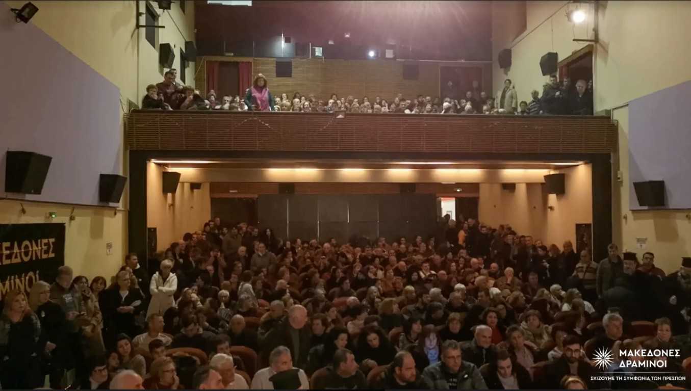 Αγαπητοί μου, αυτό που συμβαίνει σήμερα είναι συγκλονιστικό. Έχει γεμίσει η πλατεία, ο εξώστης, οι διάδρομοι και το φουαγιέ του κινηματογράφου. Ήδη έχει αρχίσει να αποχωρεί ο κόσμος που δεν χωράει στο φουαγιέ. Και χίλιες θέσεις να υπήρχαν θα τις γεμίζατε. Και μόνον αυτό είναι ένα μήνυμα για το τι σημαίνει η Μακεδονία για εμάς τους Δραμινούς και για το αν την παραχωρούμε ή όχι.