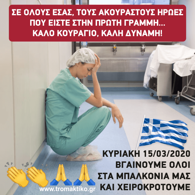 “Την Κυριακή 15 Μαρτίου και ώρα 21:00 ακριβώς βγαίνουμε στα μπαλκόνια μας και για πέντε λεπτά χειροκροτούμε τους Ανθρώπους που αγωνίζονται για μας…Τους Ανθρώπους του Συστήματος Υγείας…Ας ακουστεί το χειροκρότημα μας σε κάθε Νοσοκομείο και κάθε σημείο παροχής Υγείας για να τους δώσουμε κουράγιο για τις μέρες που ακολουθούν! Και όχι μόνο …όλους τους ανθρώπους που δουλεύουν αυτή την περίοδο για εμάς!”