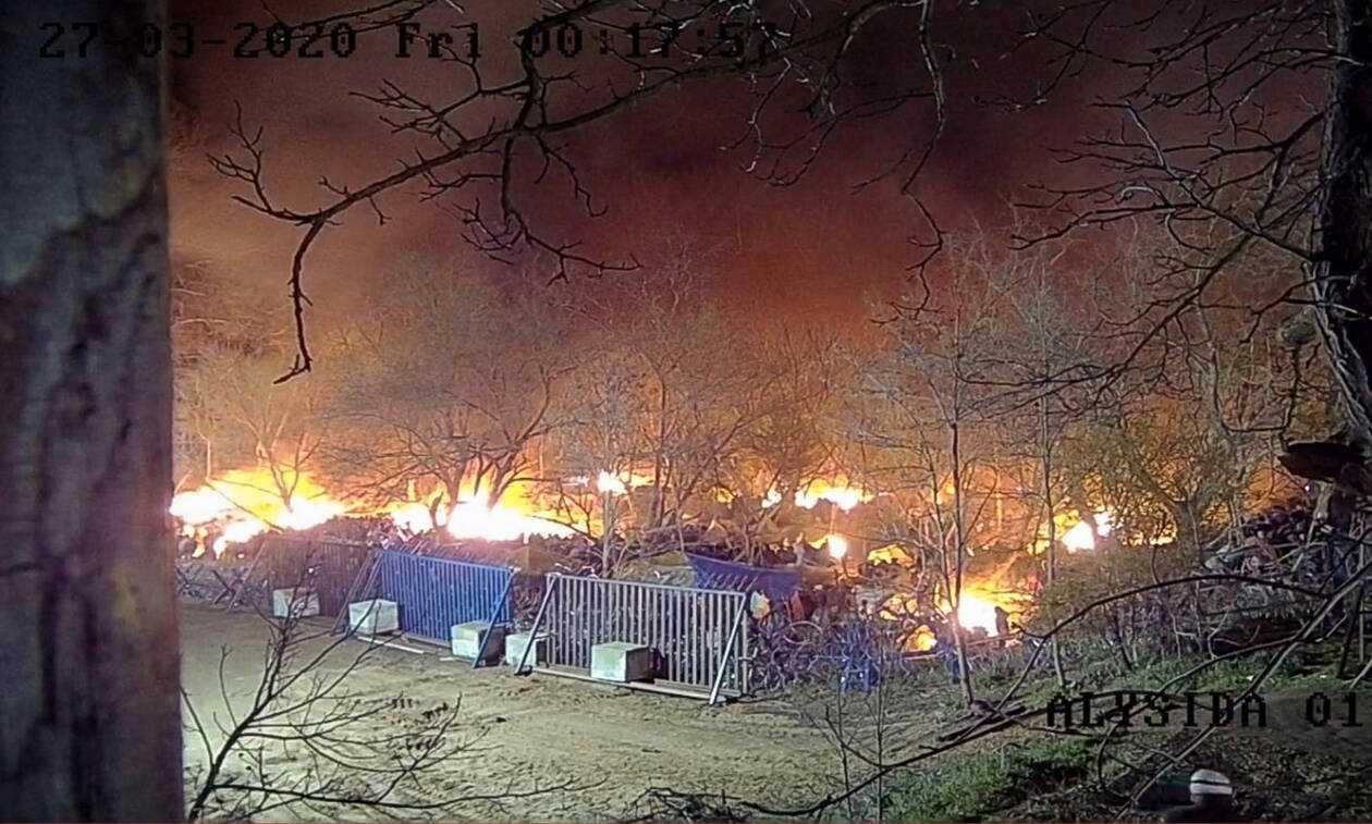 Στα πλάνα φαίνονται οι σκηνές να έχουν τυλιχθεί στις φλόγες κάποια στιγμή κατά τη διάρκεια της νύχτας –δηλαδή πριν απομακρυνθούν από την περιοχή οι πρόσφυγες και μετανάστες.